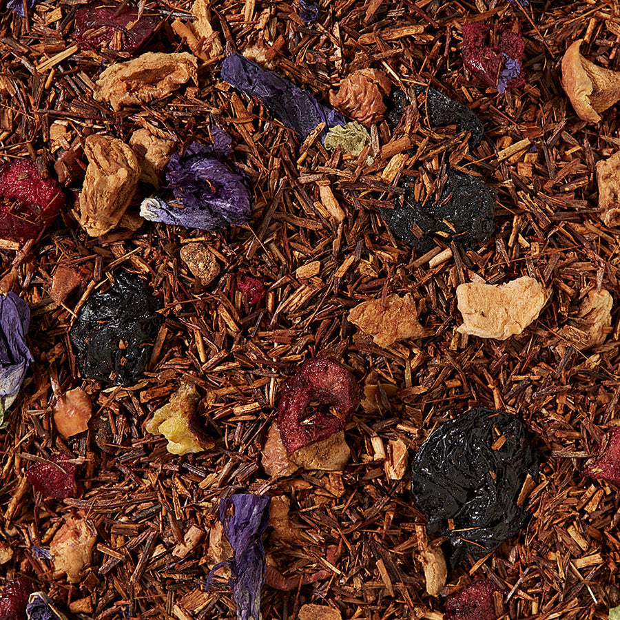 Rooibos tea, apple pieces, flavoring, sour cherries, freeze-dried pieces of plum, freeze-dried sour cherry pieces, mallow blossoms