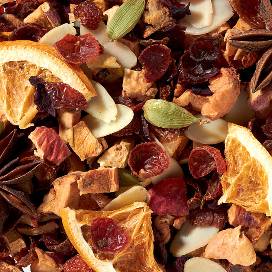 Apple pieces, rose hip peel, sliced almonds, whole star aniseed, orange slices, flavoring, cardamom (whole), beetroot pieces. Caffeine free. Brew for 4-6 minutes, at 210F.