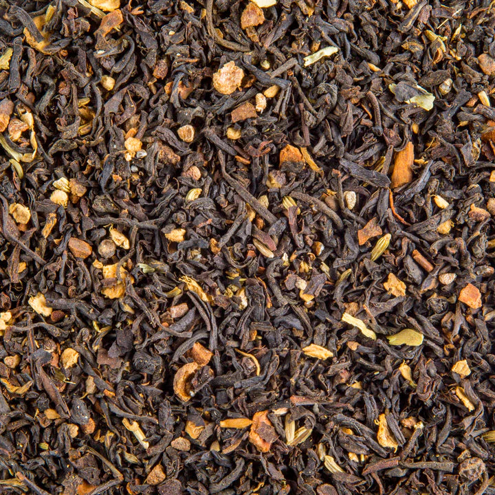 A deeper, darker, spicier version of our Mixed Spice Chai. The spices are roasted and roughly ground, and we use a robust, CTC Assam base. Assam black tea, cinnamon, cloves, cardamom, ginger, black pepper, fennel. You can brew it with milk and sugar or use your own recipe. It is divine either way. -